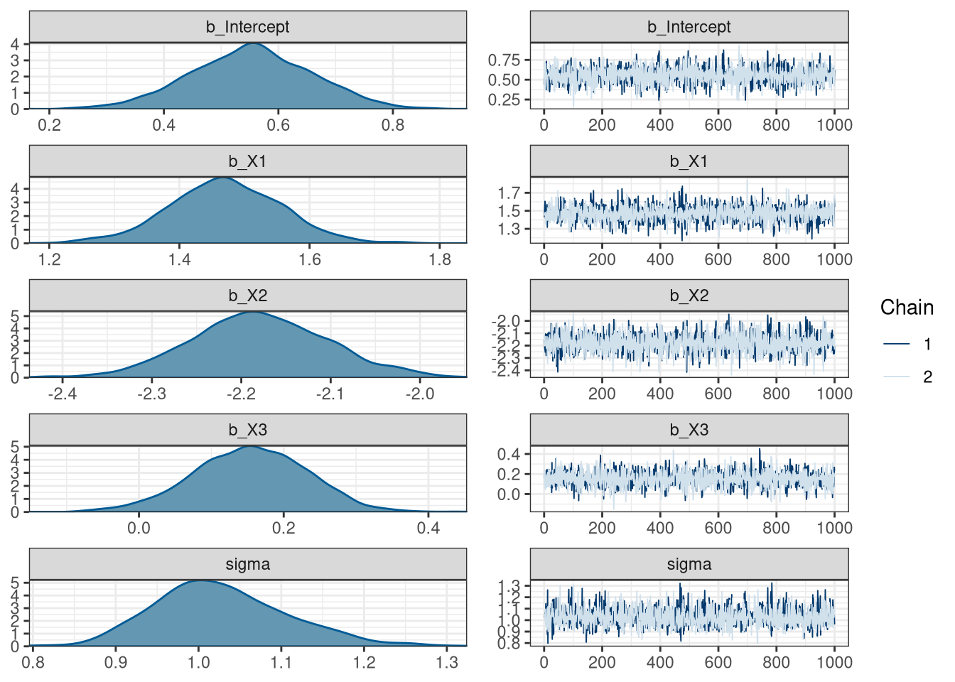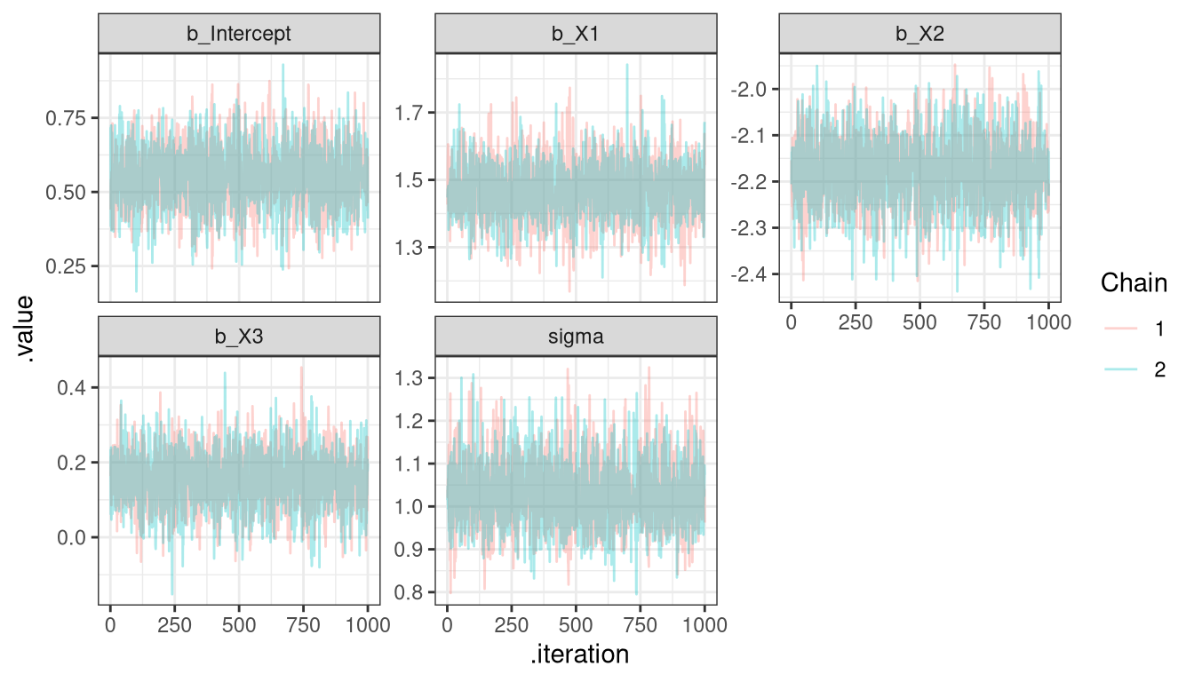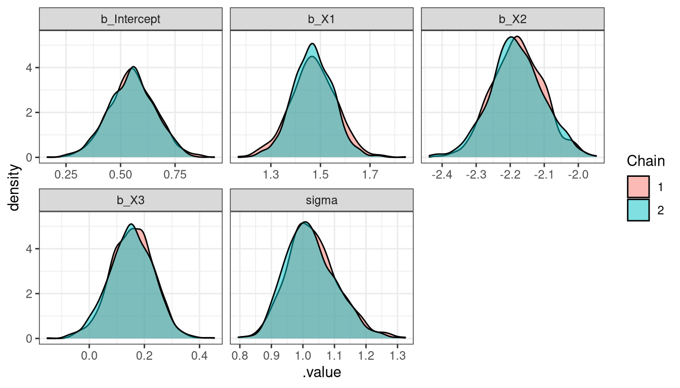 Draws: 2 chains, each with iter = 2000; warmup = 1000; thin = 1;