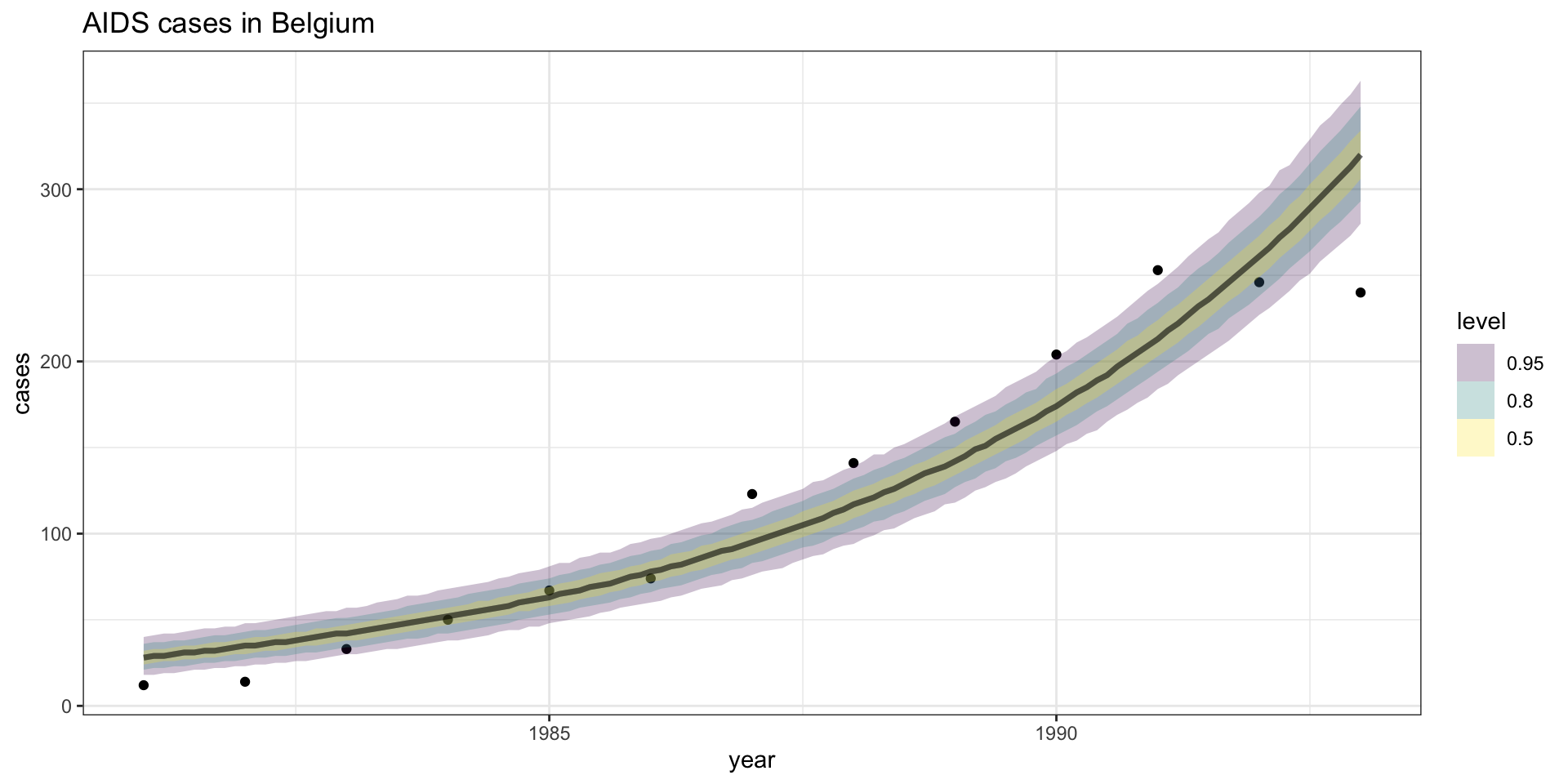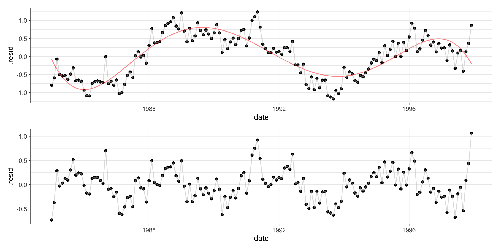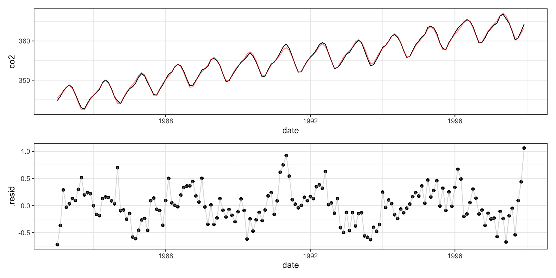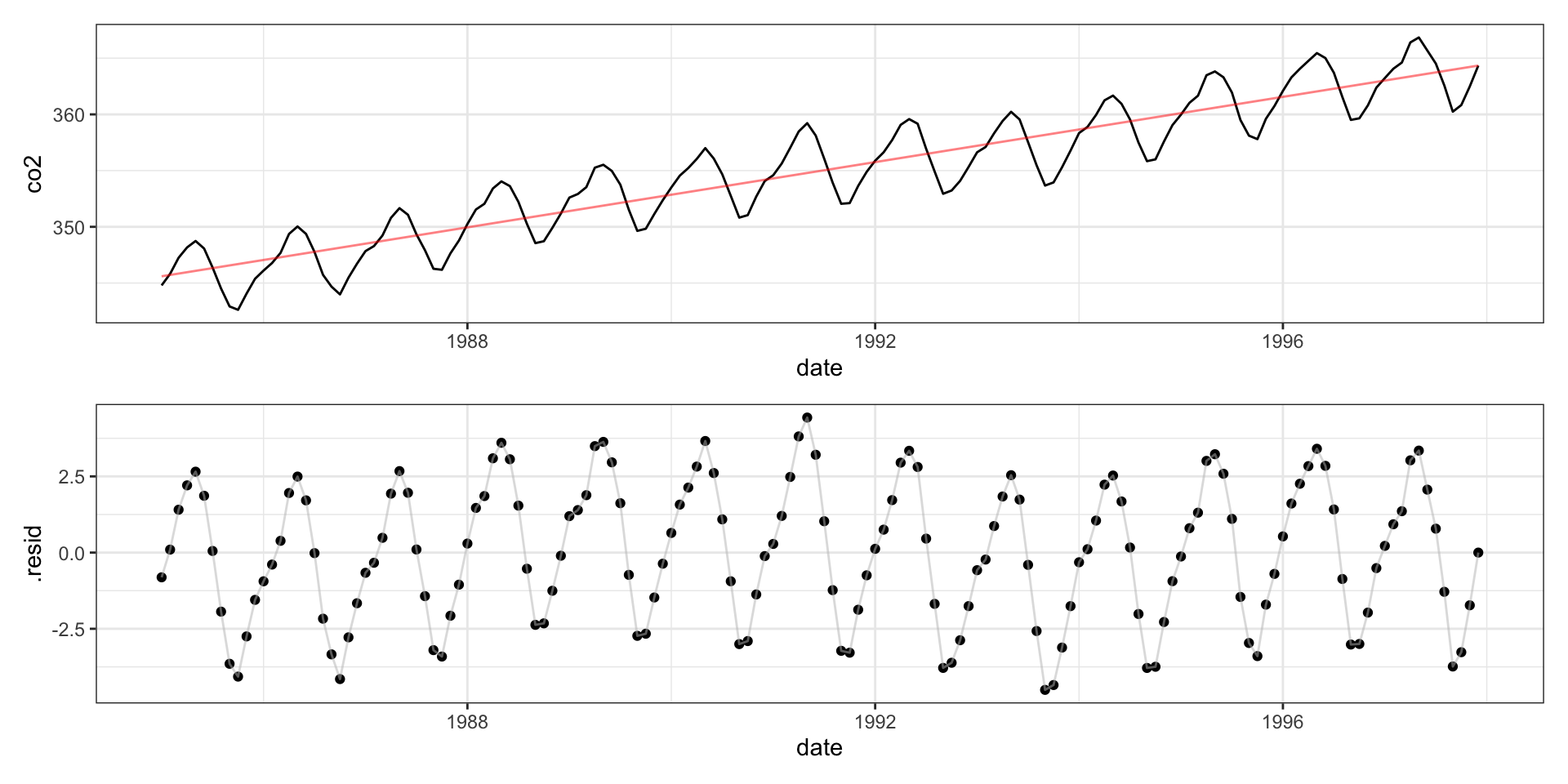 lm(formula = co2 ~ date + month + poly(date, 5), data = mauna_loa)