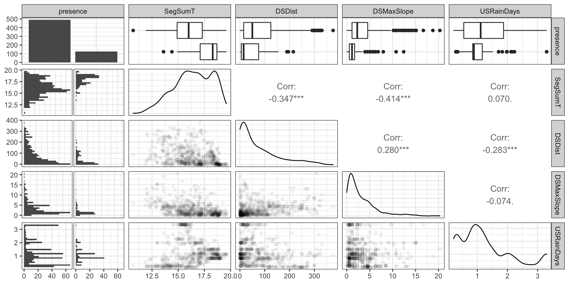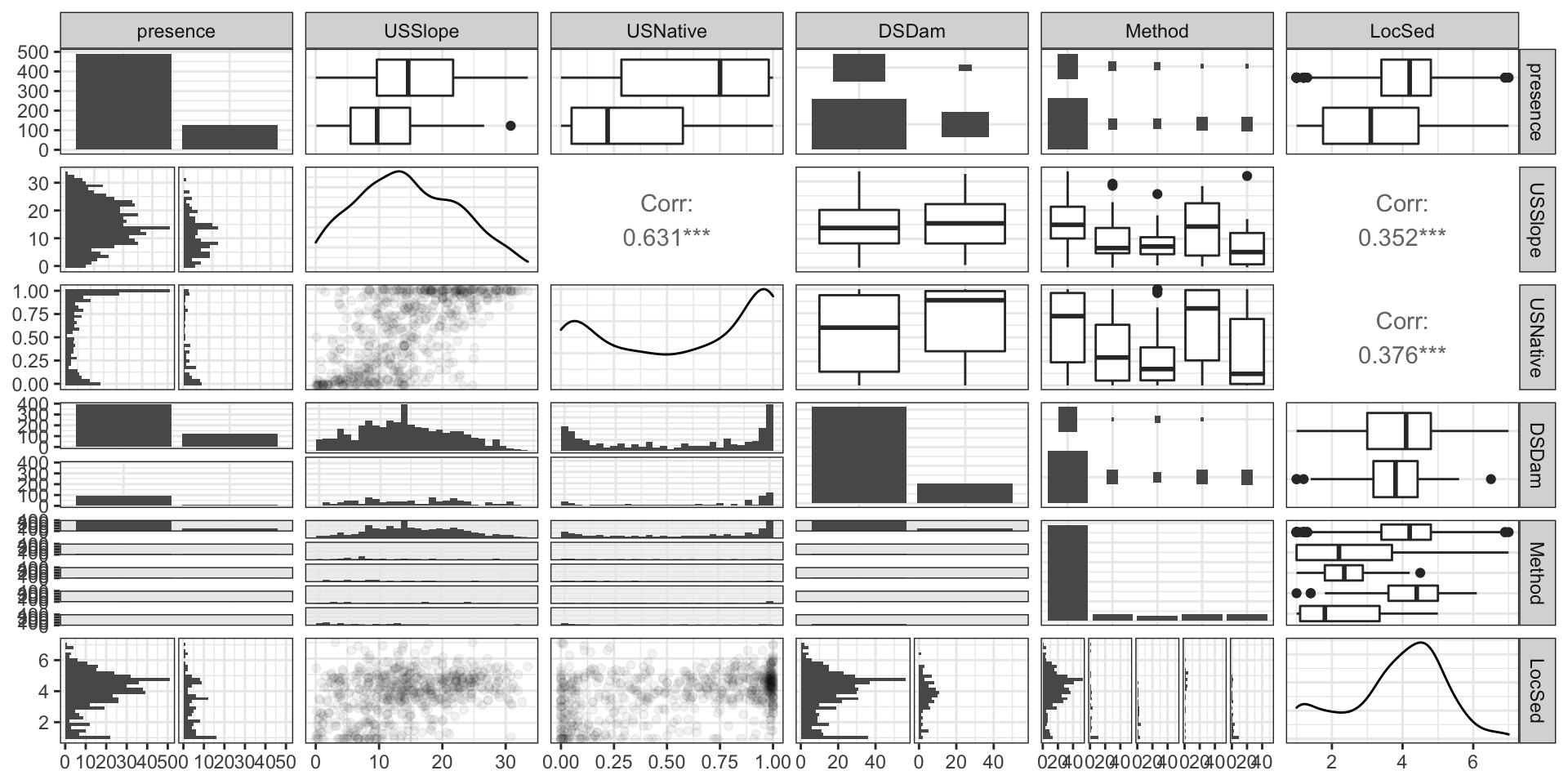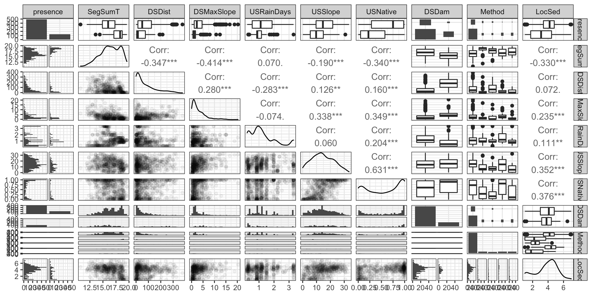 presence SegSumT DSDist DSMaxSl…¹ USRai…² USSlope USNat…³ DSDam Method LocSed