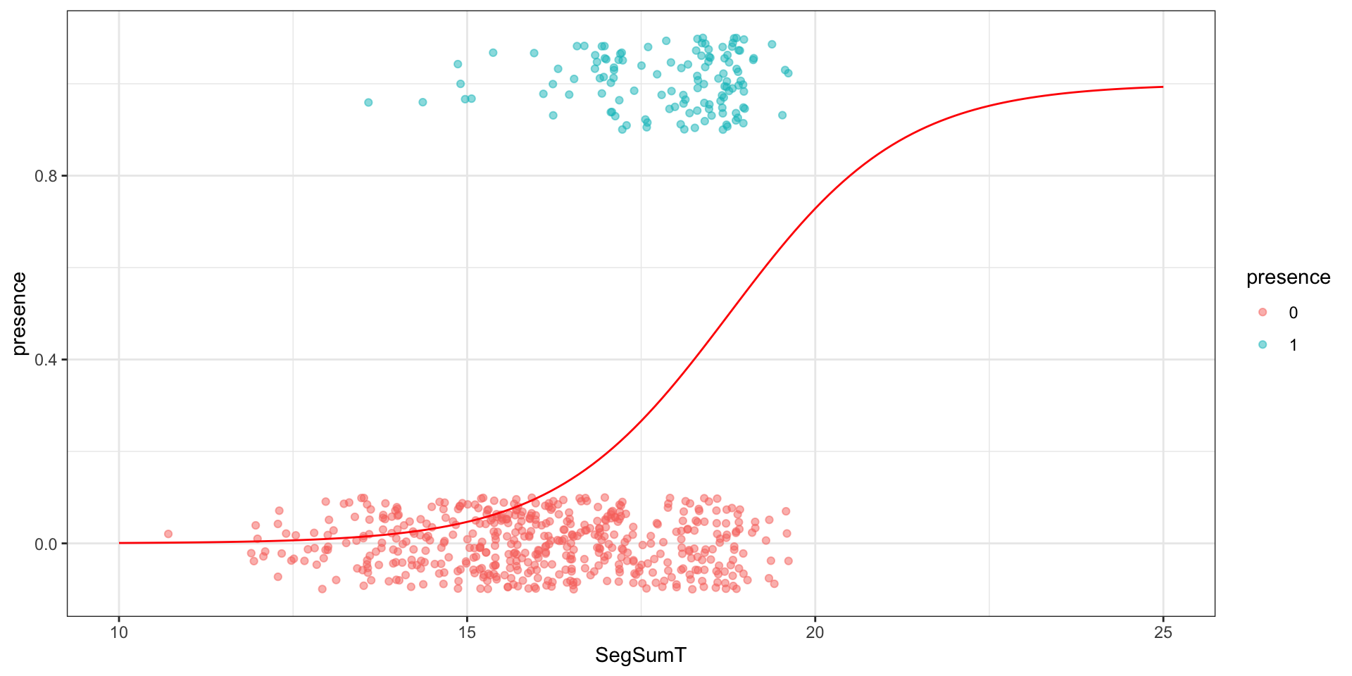 glm(formula = presence ~ SegSumT, family = binomial, data = anguilla_train)