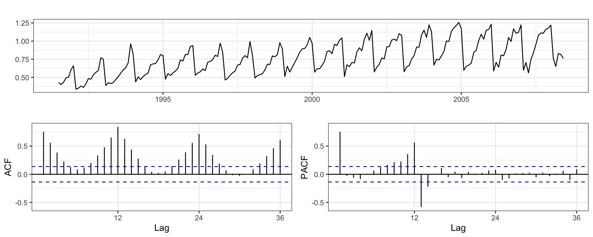 Lets consider an \(\text{ARIMA}(0,0,0) \times (1,0,0)_{12}\): \[ \begin{aligned} (1-\Phi_1 L^{12}) \, y_t = \delta + w_t \\ y_t = \Phi_1 y_{t-12} + \delta + w_t \end{aligned} \]
