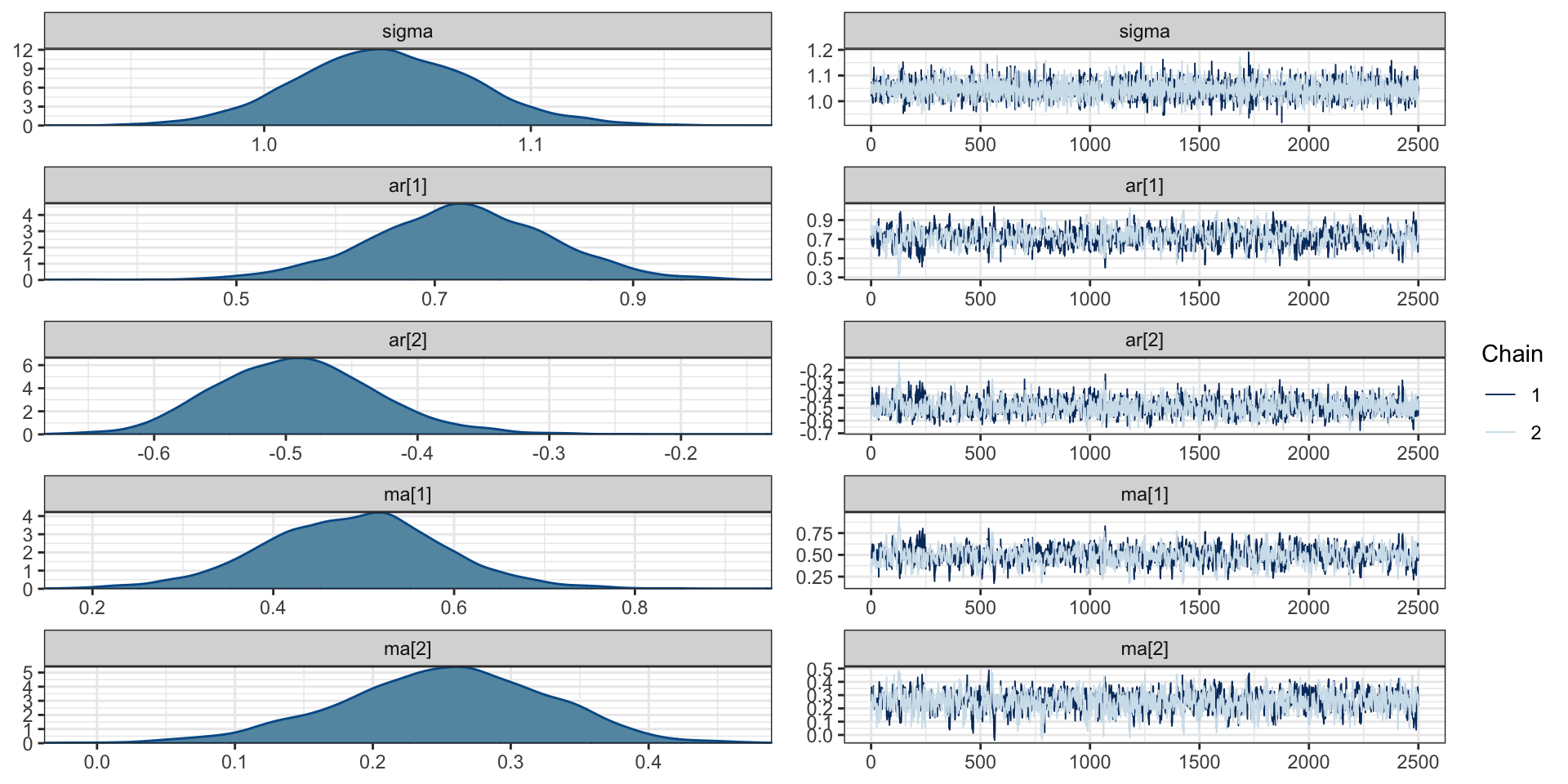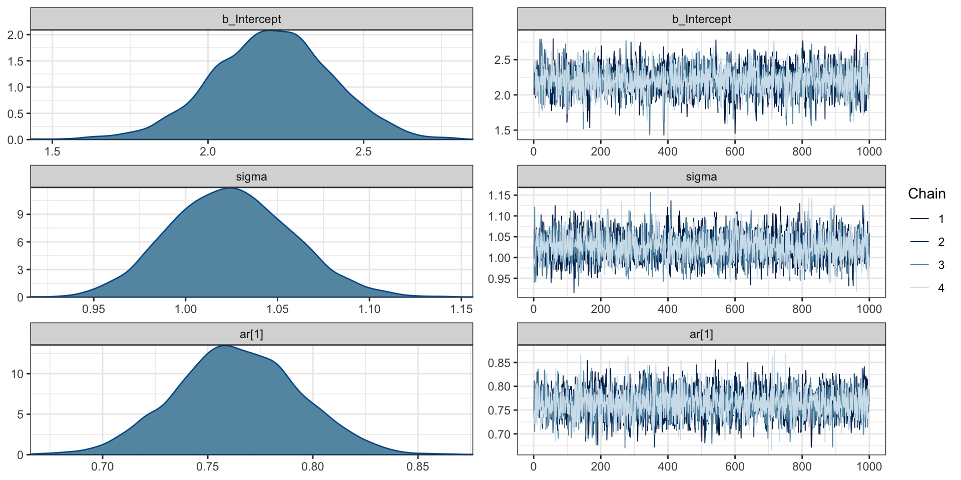 ( ar1_brms = brm(y ~ arma(p = 1, q = 0), data=d, refresh=0) ) Family: gaussian
