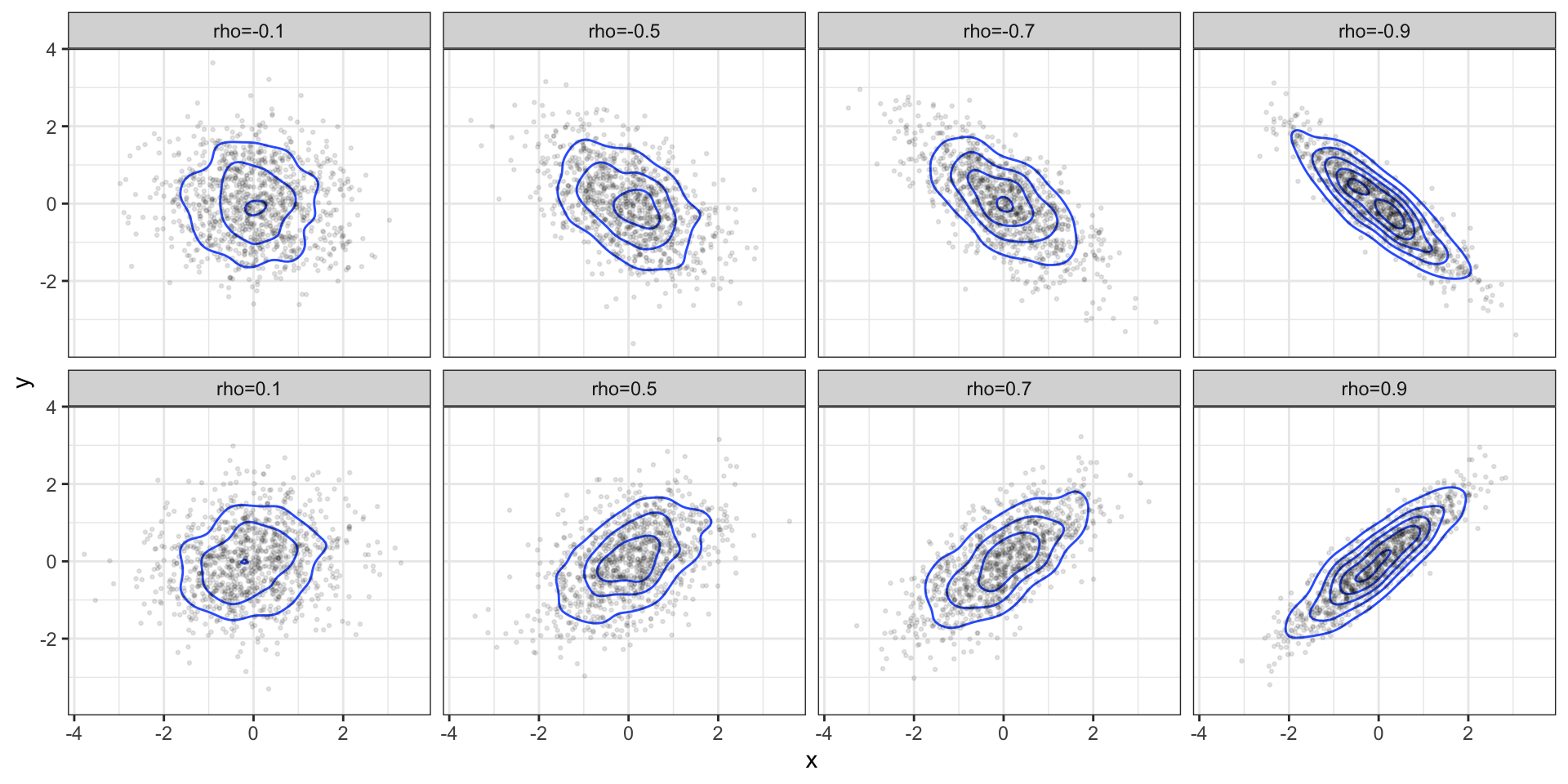 \[ \boldsymbol{\mu} = \begin{pmatrix}0 \\ 0\end{pmatrix} \qquad \boldsymbol{\Sigma} = \begin{pmatrix}1 & \rho \\ \rho & 1 \end{pmatrix}\]