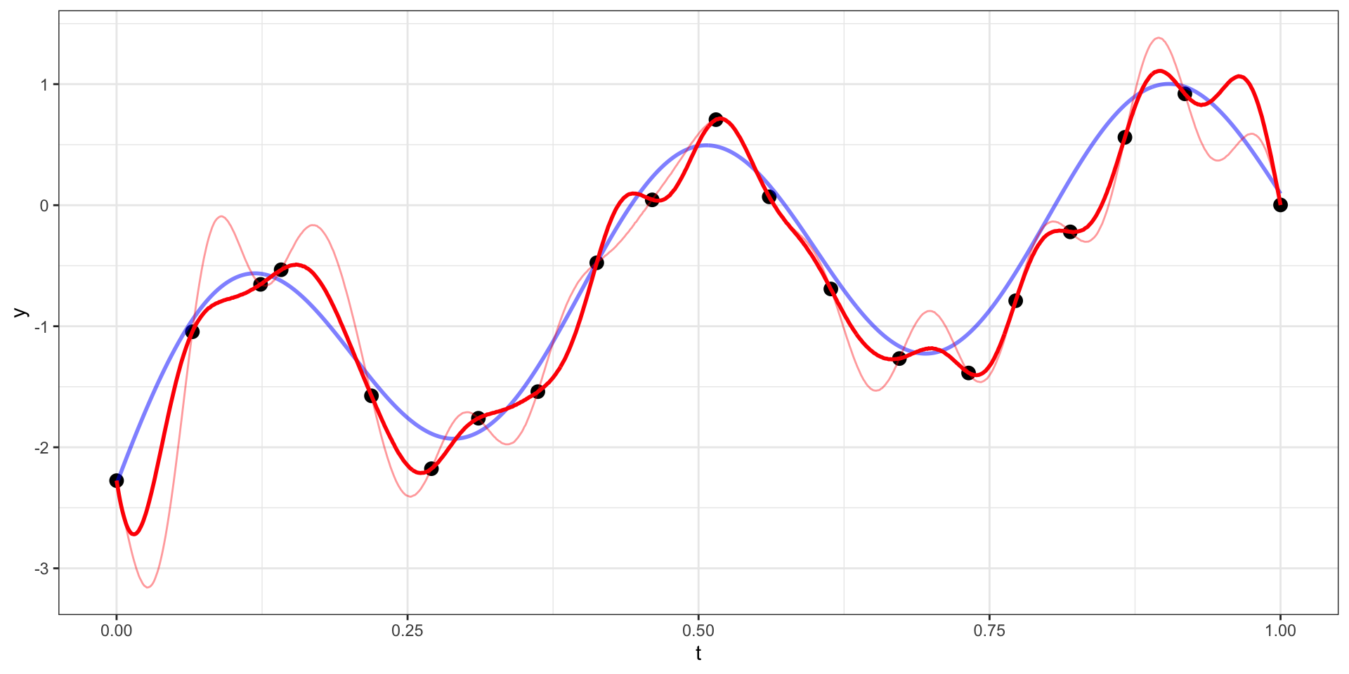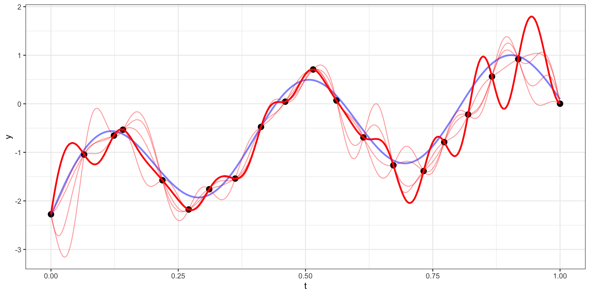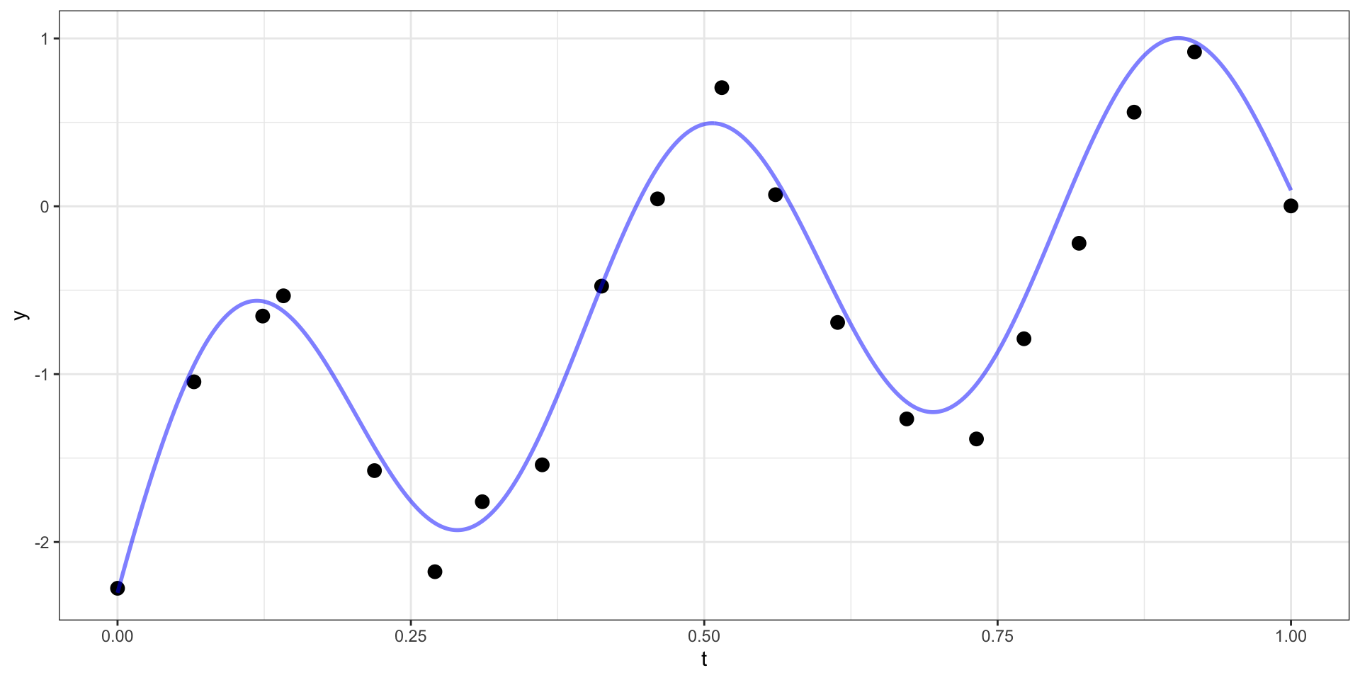 Our example has 20 observations which we would like to use as the basis for predicting \(y(t)\) at other values of \(t\) (say a regular sequence of values from 0 to 1).