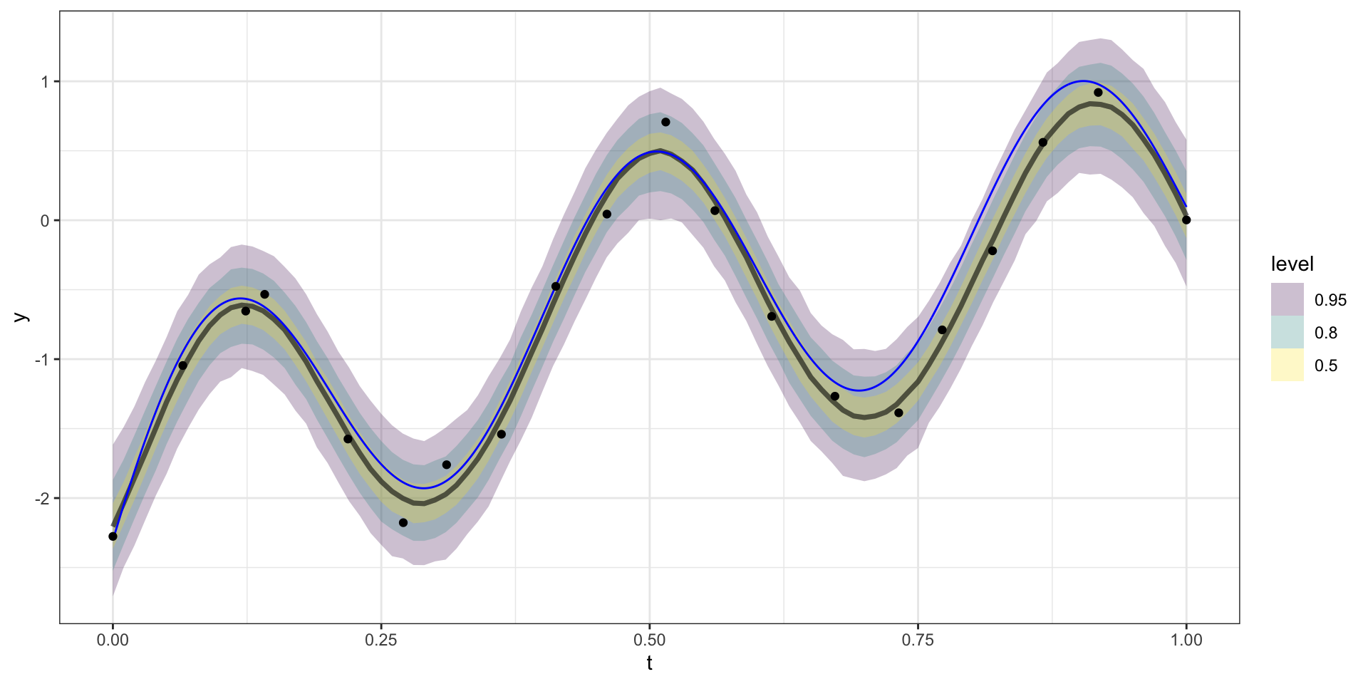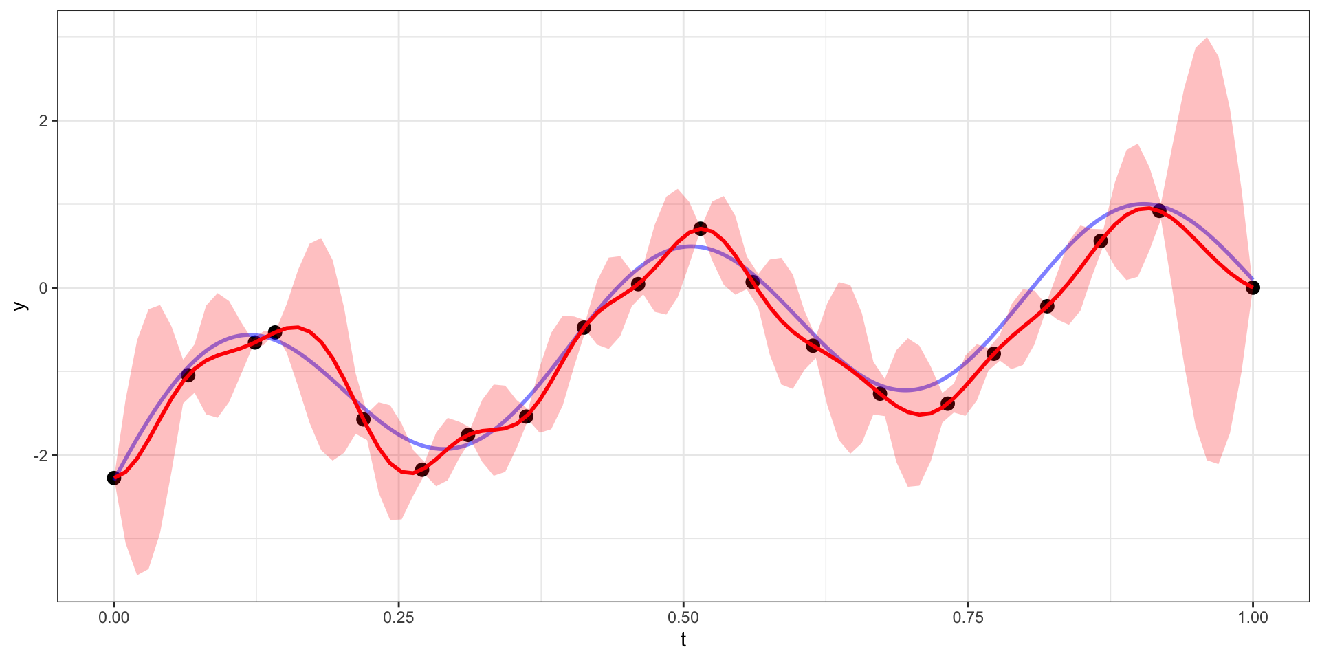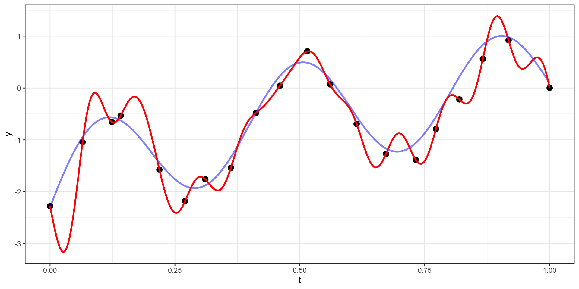 Our example has 20 observations which we would like to use as the basis for predicting \(y(t)\) at other values of \(t\) (say a regular sequence of values from 0 to 1).
