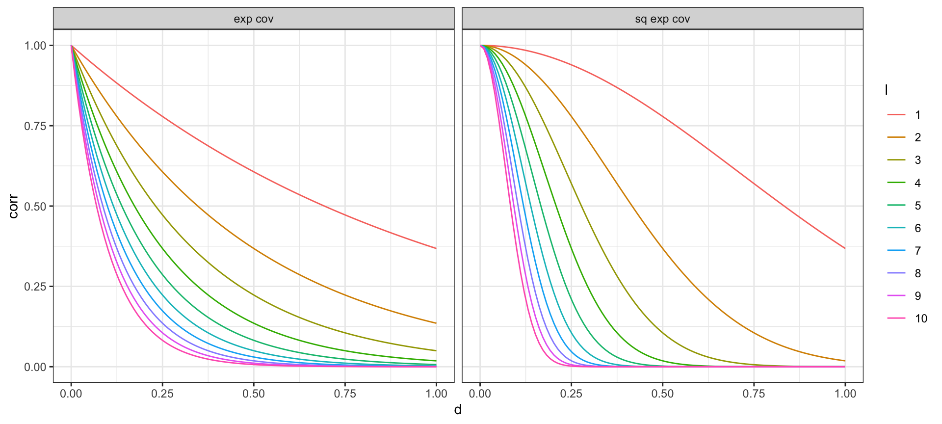 For the square exponential covariance \[ \begin{aligned} Cov(d) &= \sigma^2 \exp\left(-(l \cdot d)^2\right) \\ Corr(d) &= \exp\left(-(l \cdot d)^2\right) \end{aligned} \]