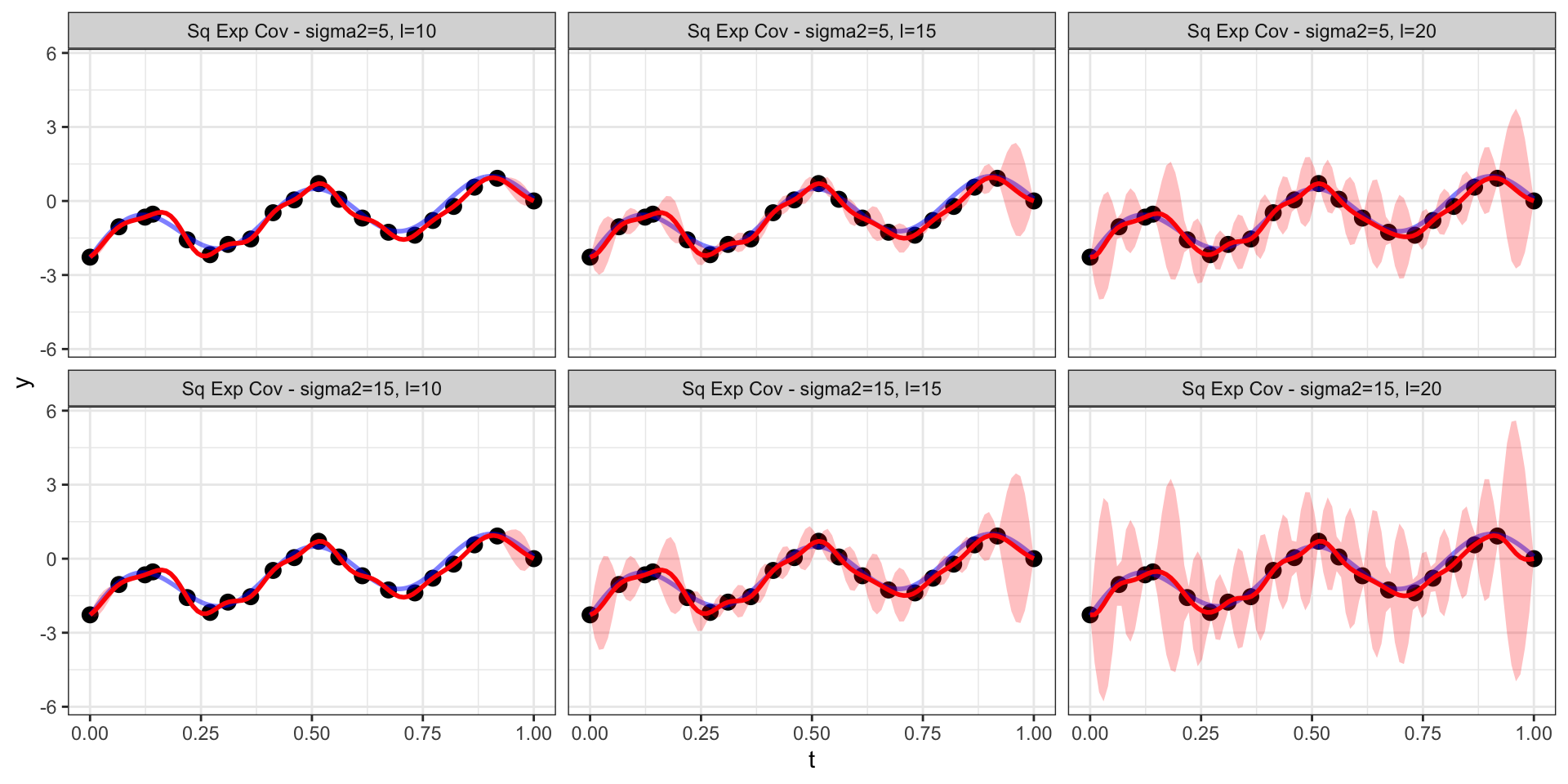 Squared exponential covariance (Gaussian): \[ \Sigma(y_{t},y_{t'}) = \sigma^2 \exp\big(-(|t-t'| \; l\,)^2\big) \]