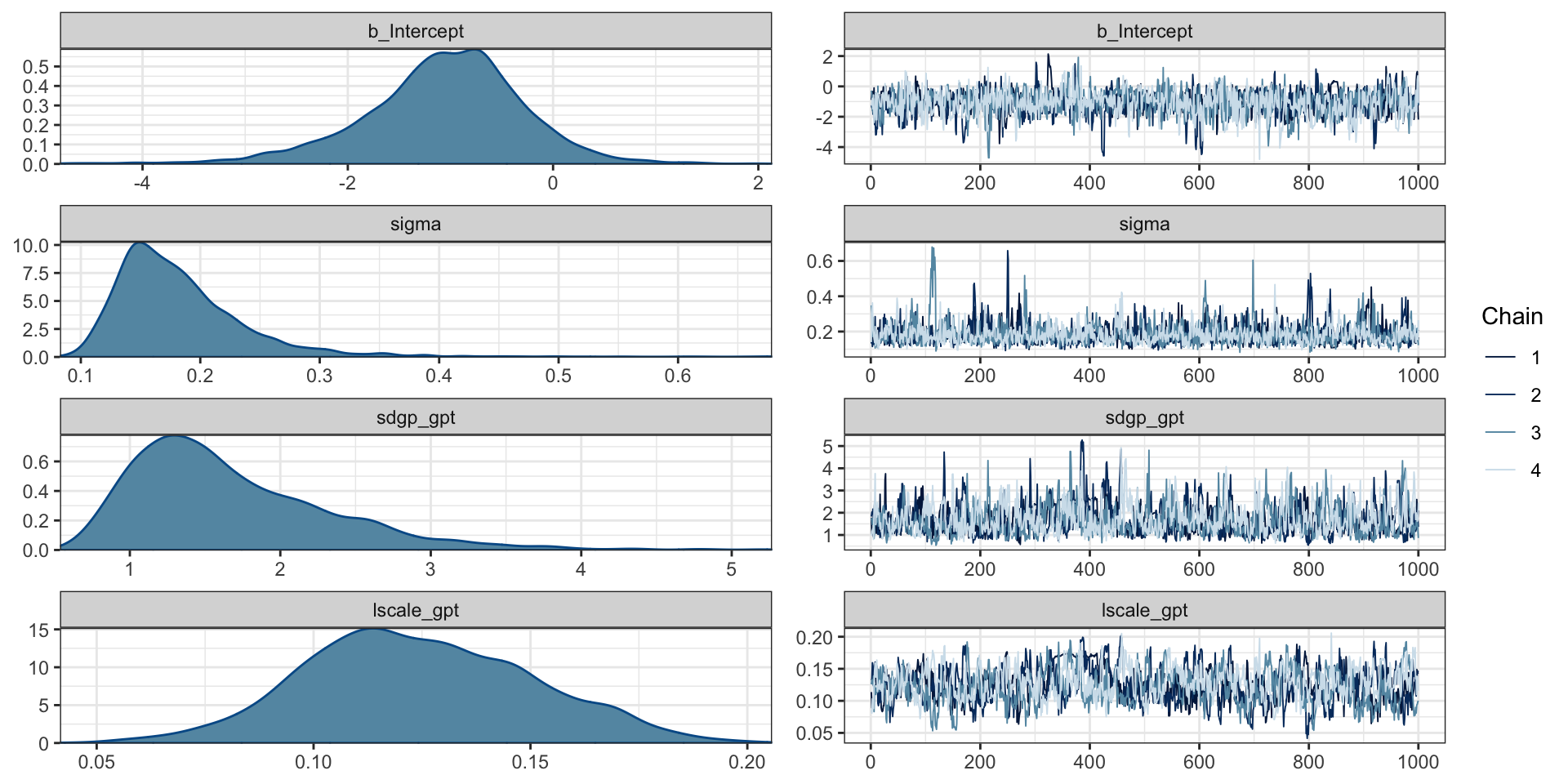 Draws: 4 chains, each with iter = 2000; warmup = 1000; thin = 1;