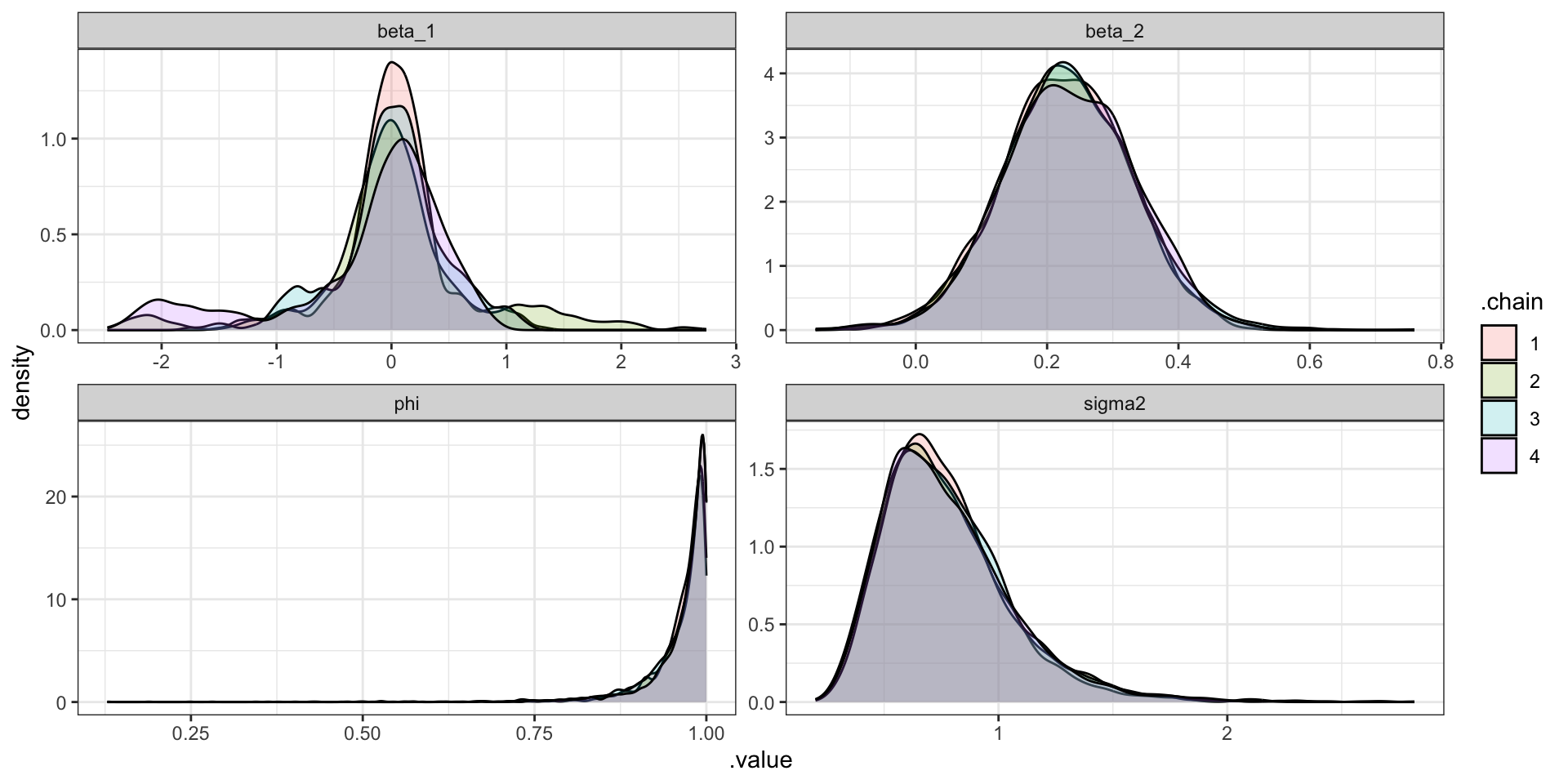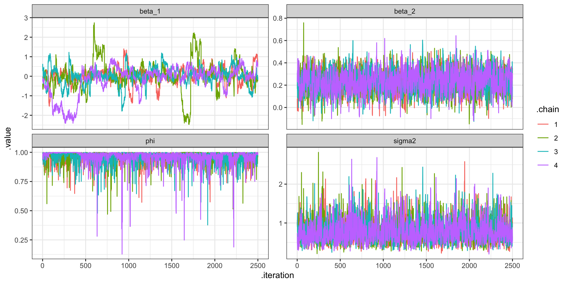 )# A gplm model (spBayes spLM) with 4 chains, 4 variables, and 4000 iterations.