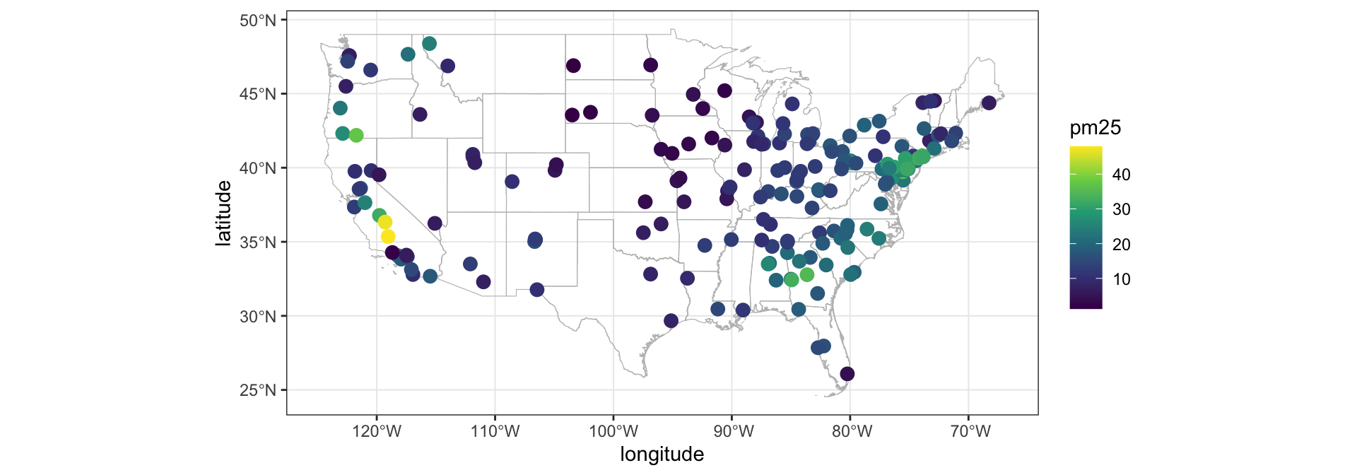 The Chemical Speciation Network are a series of air quality monitors run by EPA (221 locations in 2007). We’ll look at a subset of the data from Nov 11th, 2007 (n=191) for just PM2.5.