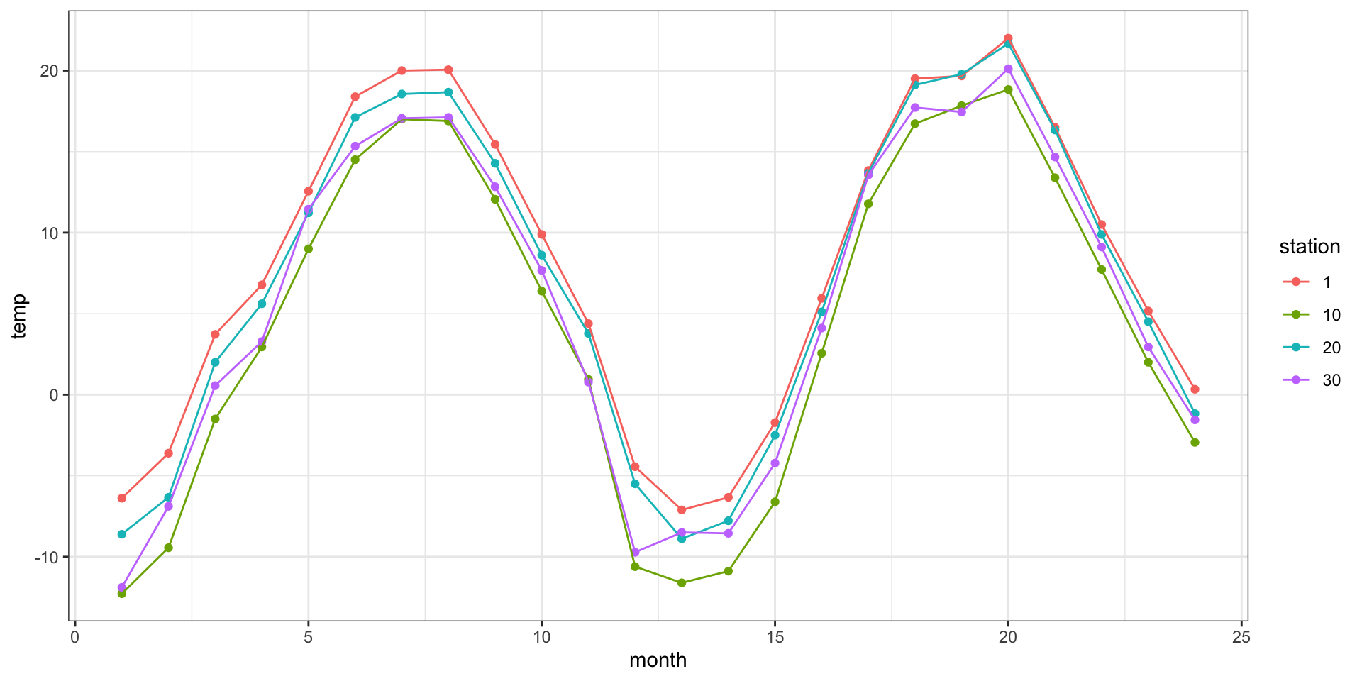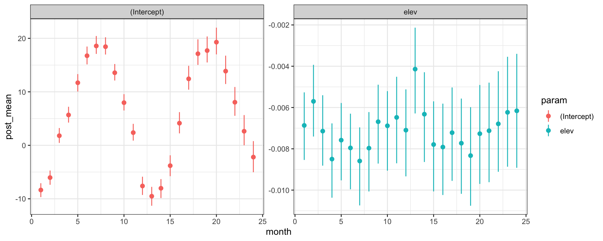 n_samples =10000models =lapply(paste0("t_",1:24, "~elev"), as.formula)m = spBayes::spDynLM( models, data = ne_temp, coords = coords, get.fitted =TRUE,starting = starting, tuning = tuning, priors = priors,cov.model ="exponential", n.samples = n_samples, n.report =1000)## ----------------------------------------## General model description## ----------------------------------------## Model fit with 34 observations in 24 time steps.## ## Number of missing observations 0.## ## Number of covariates 2 (including intercept if specified).## ## Using the exponential spatial correlation model.## ## Number of MCMC samples 10000.#### ...