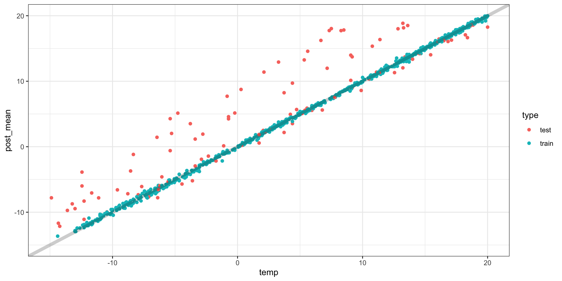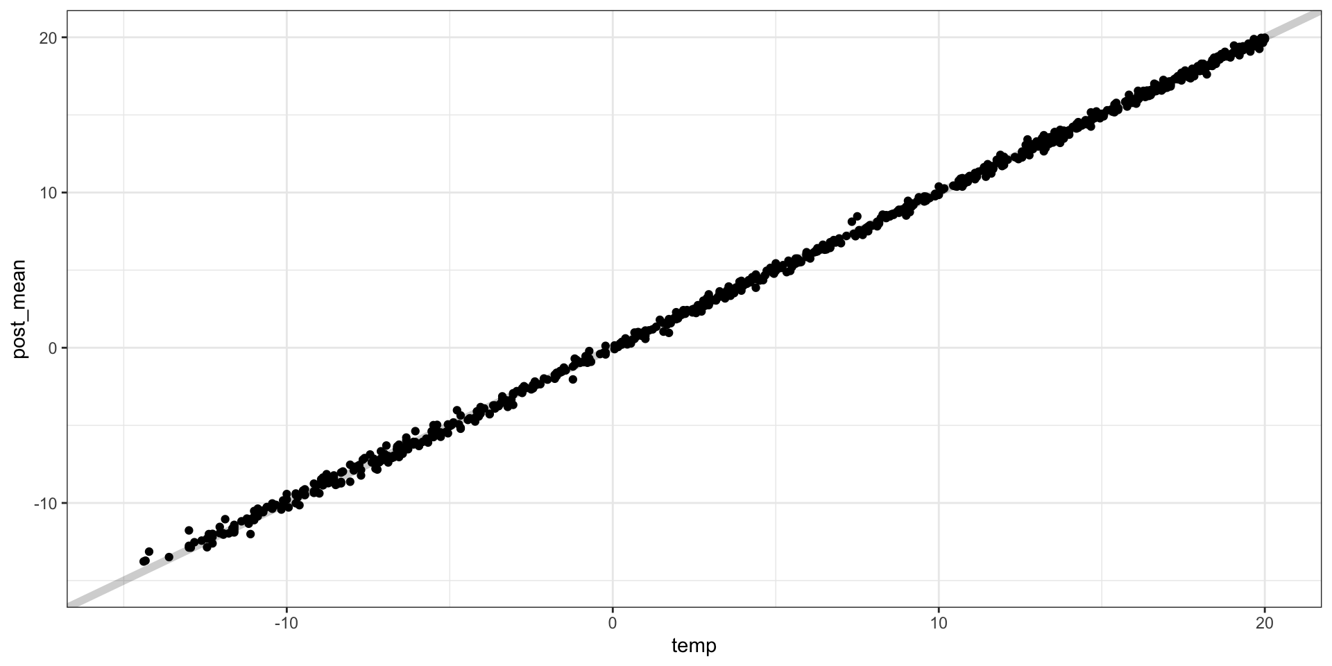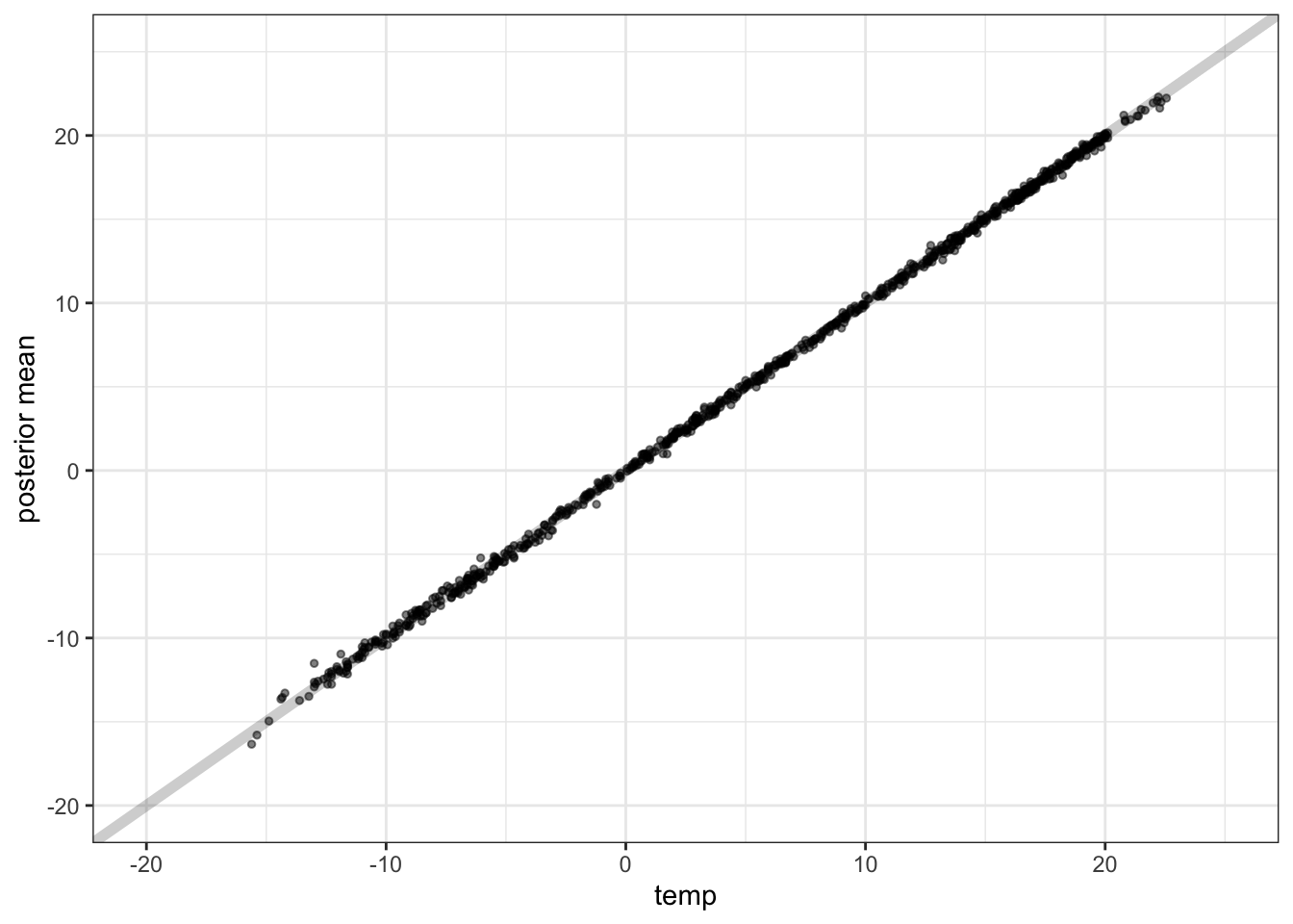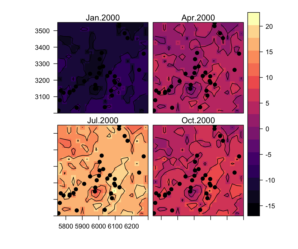 models_pred =lapply(paste0("t_",1:n_t, "~1"), as.formula)n_samples =5000m_pred = spBayes::spDynLM( models_pred, data = pred, coords = coords_pred, get.fitted =TRUE,starting = starting, tuning = tuning, priors = priors,cov.model ="exponential", n.samples = n_samples, n.report =1000)## ----------------------------------------## General model description## ----------------------------------------## Model fit with 434 observations in 24 time steps.## ## Number of missing observations 9600.## ## Number of covariates 1 (including intercept if specified).## ## Using the exponential spatial correlation model.## ## Number of MCMC samples 5000.